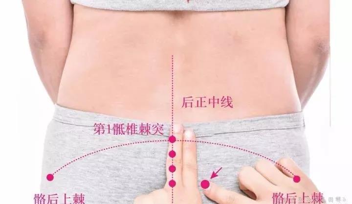 坐位,从骨盆后面髂嵴最高点向内下方骶角两侧循摸可触及一高骨突起(髂后上棘),与之平行的髂骨正中突起处即第2骶椎棘突,向下数2个椎体,即第4骶椎棘突,旁开1.5寸处,按压有痛感。