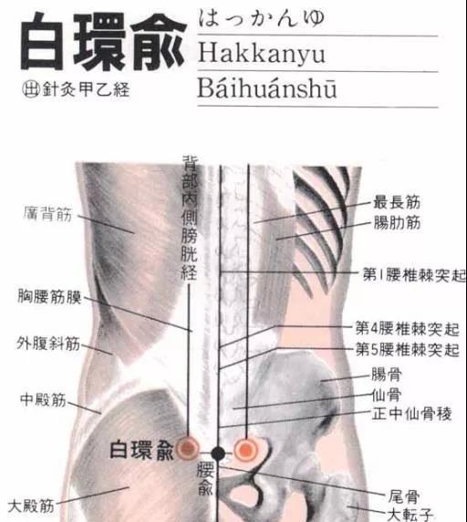白环俞穴(BL30)别名腰俞穴。属足太阳膀胱经,在骶正中嵴(第4骶椎棘突下)旁开1.5寸。常用于治疗坐骨神经痛、子宫内膜炎、小儿麻痹后遗症、下肢瘫痪等。